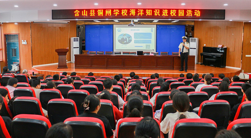2023年9月20日下午,安徽省含山縣銅閘學(xué)校報(bào)告廳內(nèi)座無(wú)虛席、掌聲雷動(dòng)!銅閘學(xué)校七、八年級(jí)全體師生齊聚一堂,聆聽中國(guó)交通部高級(jí)船長(zhǎng)胡月祥講解海洋知識(shí)。